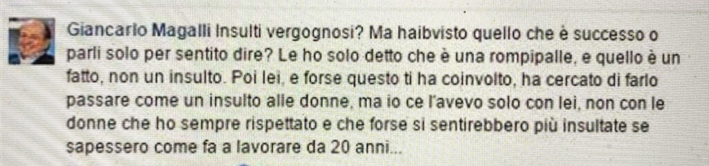 Giancarlo con le tue azioni hai cambiato il corso della mia vita lavorativa ma forse non sai che sei riuscito a tirare fuori una forza che neppure io sapevo di avere, l’ho tirata fuori per rispondere ai tuoi insulti, alle gravi allusioni e alle cattiverie gratuite che hai detto e scritto.