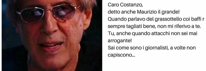 Ma il riferimento fatto dai follower con Costanzo, in realtà, non è così. Ed è lui stesso ad aver spento la polemica. In un post di poche ore fa, il cantante ha scritto: «Caro Costanzo, detto anche Maurizio il grande! Quando parlavo del grassottello coi baffi non sempre tagliati bene, non mi riferivo a te. Tu anche quando attacchi non sei mai arrogante. Sai, i giornalisti a volte non capiscono…».