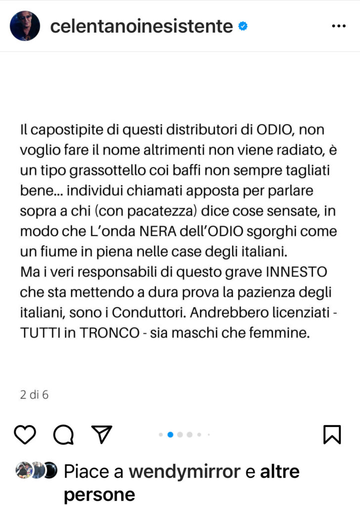 Con il nickname di “Inesistente“, Adriano Celentano è un fiume in piena su Instagram, dove si scaglia contro ciò che vede in televisione. Negli ultimi giorni il cantante ha parlato dei talk show, responsabili, secondo lui, dell’odio che si respira per strada. In un lungo post di sei immagini, Celentano ha sparato a zero sui conduttori tv, in particolare su chi affronta temi come il Covid e i vaccini, cioè tutti di questi tempi, sottolineando la sua posizione:  andrebbero licenziati tutti.