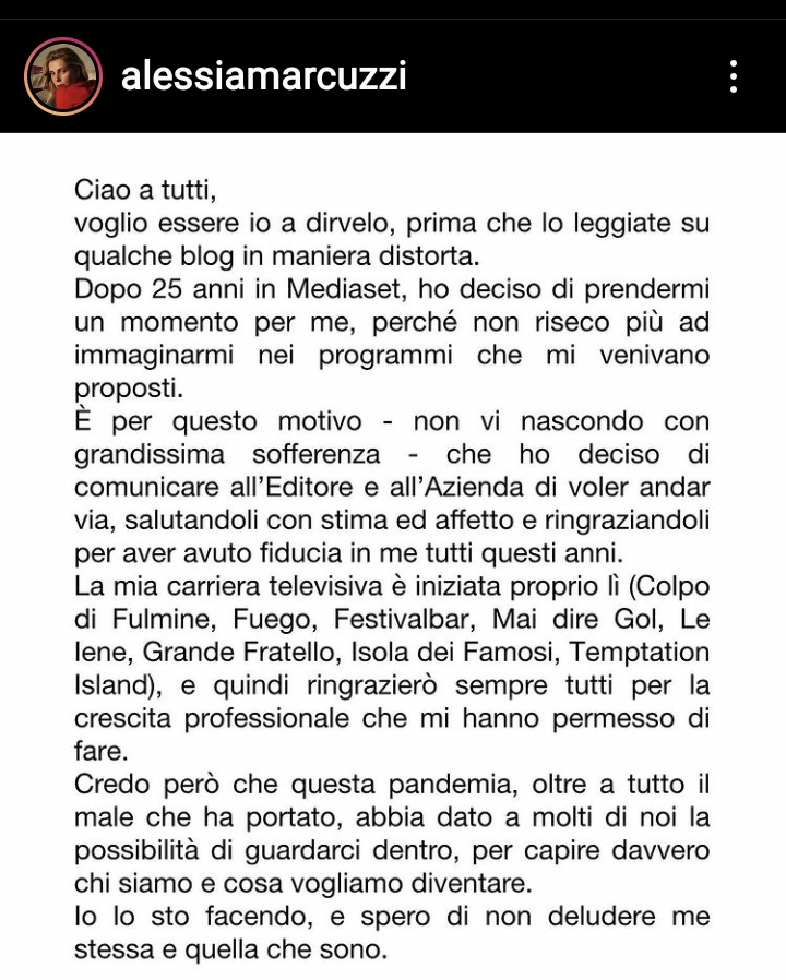 Con un post sul suo personale Instagram, Alessia Marcuzzi conduttrice e showgirl della tv italiana comunica il suo addio a Mediaset.