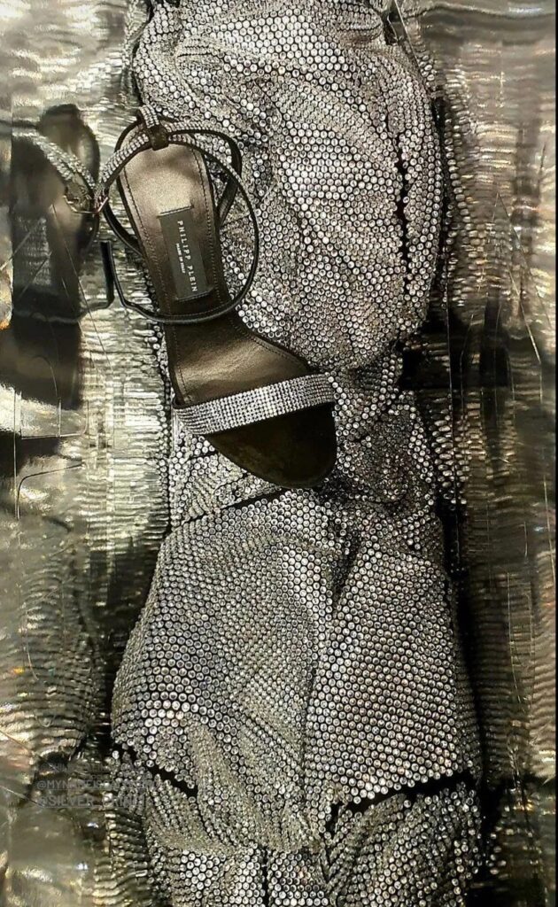Un total look firmato Philipp Plein, un abito custom color argento con gonna al ginocchio, stretto leggermente in vita con apertura a goccia sulla schiena.