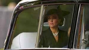 Kate Middleton indossava veletta nera, abito scuro orecchini e collier di perle e diamanti, elegante e di classe come sempre.