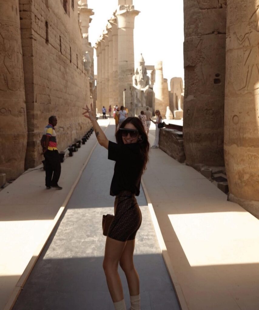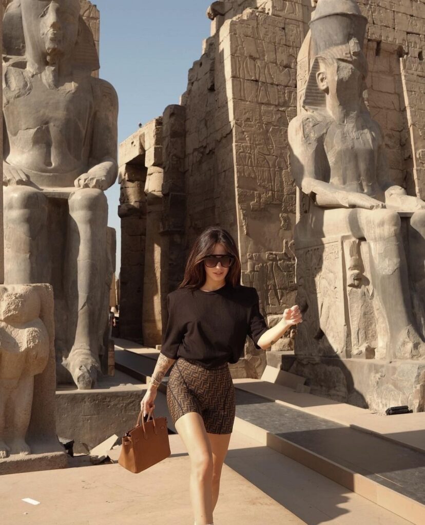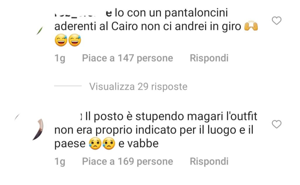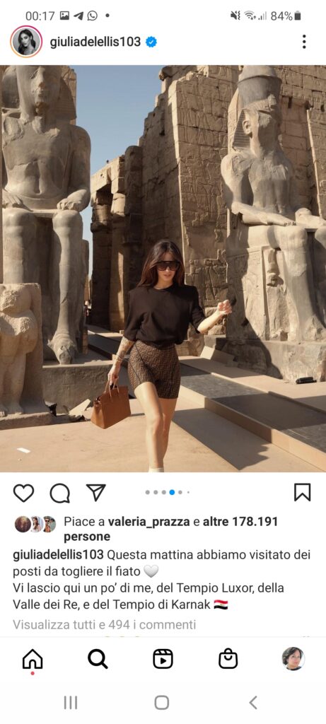 —– Giulia De Lellis da qualche giorno è in vacanza in Egitto con i suoi suoceri ed il suo fidanzato Carlo Gussalli  rampollo della famiglia Beretta, produttrice di armi e leader nel suo settore. Ovviamente non sono mancati numerosi selfie e storie sul suo profilo Instagram, che hanno dato vita a molte polemiche e critiche, sorte a causa del suo outfit. I follower non hanno apprezzato la scelta dei suoi vestiti, nel momento in cui hanno visitato i luoghi sacri della “Valle dei Re”, definiti inadeguati e irriverenti nei confronti della religione musulmana, delle loro tradizioni. In una delle ultime foto indossa una t-shirt nera e un paio di short aderenti, correlata dalla scritta: