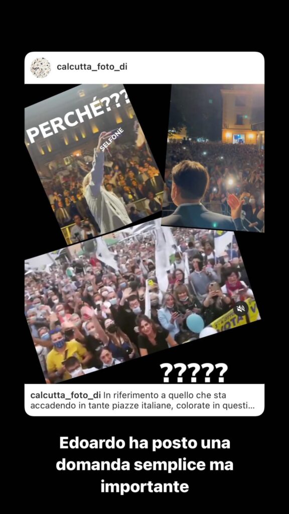 “Mi continuo a domandare perché solo in Italia non si fa nulla per introdurre norme e progettualità per far ripartire il mondo dello spettacolo con gli strumenti che oggi sono a disposizione e che potrebbero garantire la sicurezza di tutti. Queste immagini festose rappresentano un vero e proprio schiaffo in faccia per intere famiglie che per voi sono evidentemente inesistenti”.