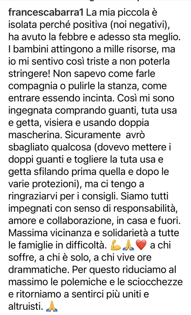 «Non sapevo come farle compagnia o pulirle la stanza, come entrare essendo incinta. Così mi sono ingegnata comprando guanti, tuta usa e getta, visiera e usando doppia mascherina. Sicuramente – ammette – avrò sbagliato qualcosa (dovevo mettere i doppi guanti e togliere la tuta usa e getta sfilando prima quella e dopo le varie protezioni), ma ci tengo a ringraziarvi per i consigli». Conclude Francesca Barra: «Siamo tutti impegnati con senso di responsabilità, amore e collaborazione, in casa e fuori. Massima vicinanza e solidarietà a tutte le famiglie in difficoltà, a chi soffre, a chi è solo, a chi vive ore drammatiche. Per questo riduciamo al massimo le polemiche e le sciocchezze e ritorniamo a sentirci più uniti e altruisti».