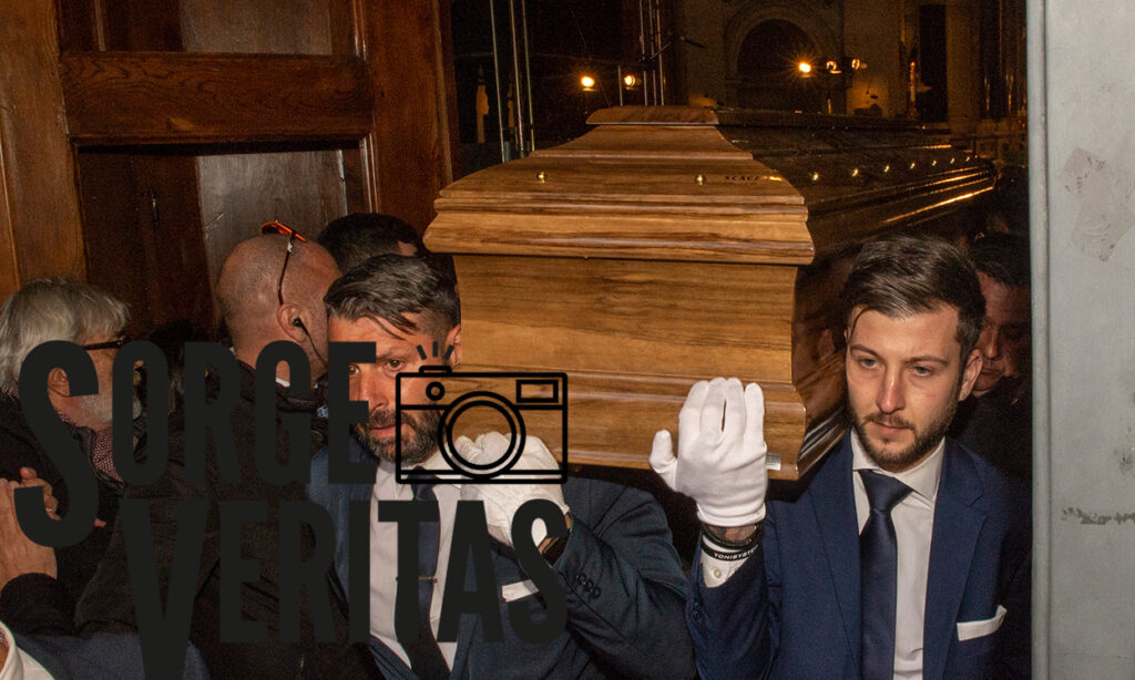 Il volto di Maria, 35 anni vissuti insieme al suo Maurizio, è trasfigurato dal senso di vuoto che la invade ogni minuto, li in quella bara di legno c‘è il compagno di una vita, della sua vita… l‘aveva chiesta in sposa dopo quello scampato attentato ai Parioli da parte della mafia, perché Maurizio non era solo uomo di spettacolo ma grande pensatore, grande portatore di giustizia e combattente.