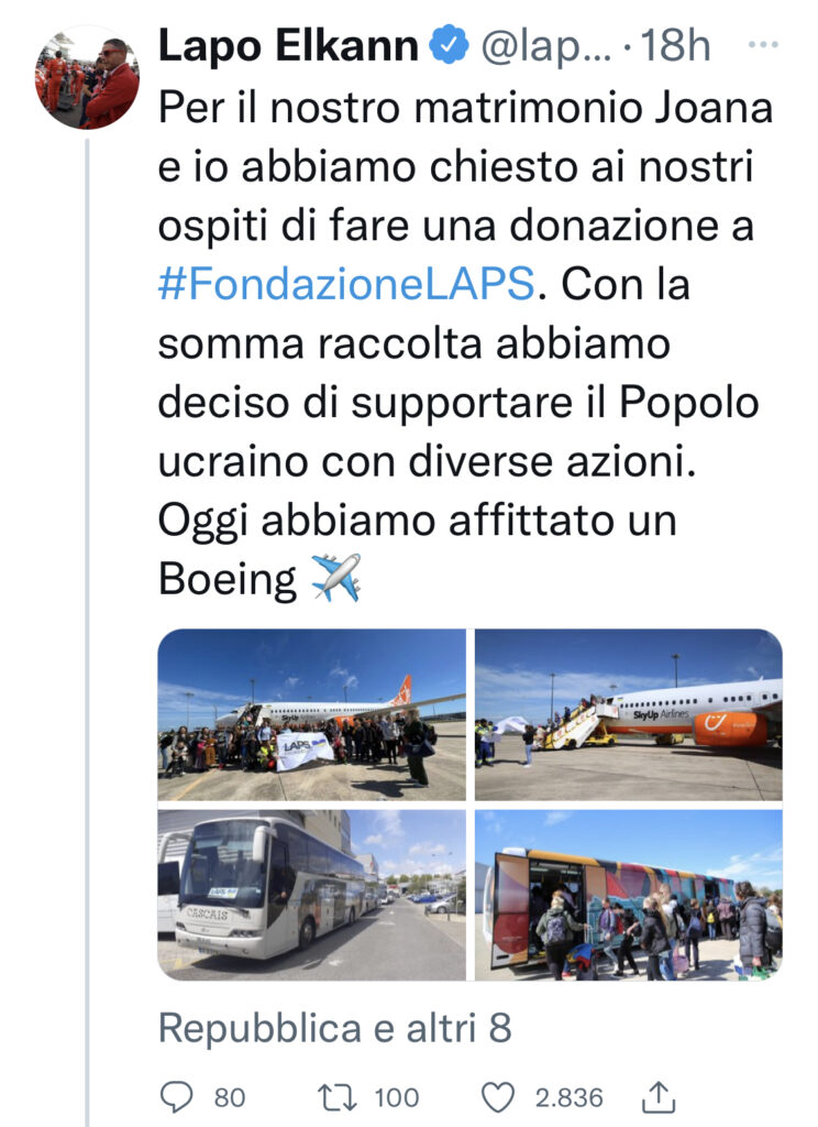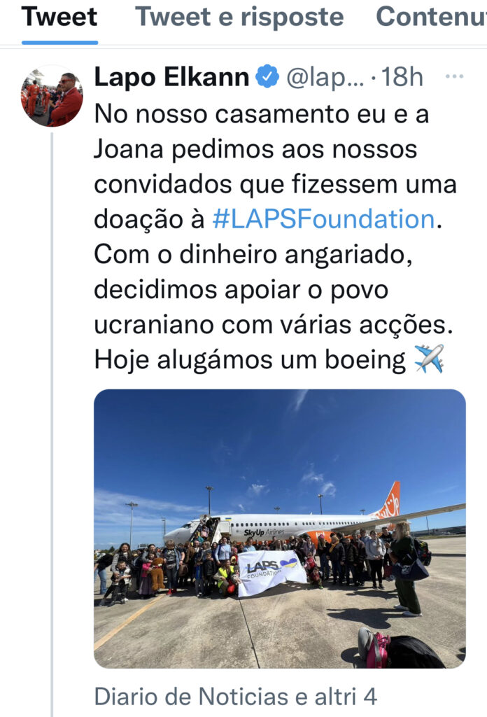 «Per il nostro matrimonio Joana e io – spiega Lapo Elkann – abbiamo chiesto ai nostri ospiti di fare una donazione a #FondazioneLaps. Con la somma raccolta abbiamo deciso di supportare il Popolo ucraino con diverse azioni. Oggi abbiamo affittato un boeing per portare in Portogallo 150 ucraini, 10 cani e 5 gatti salvandoli così dalla guerra. Auguro a loro di ritrovare la serenità. Un grande grazie al Sindaco di Cascais per il supporto».