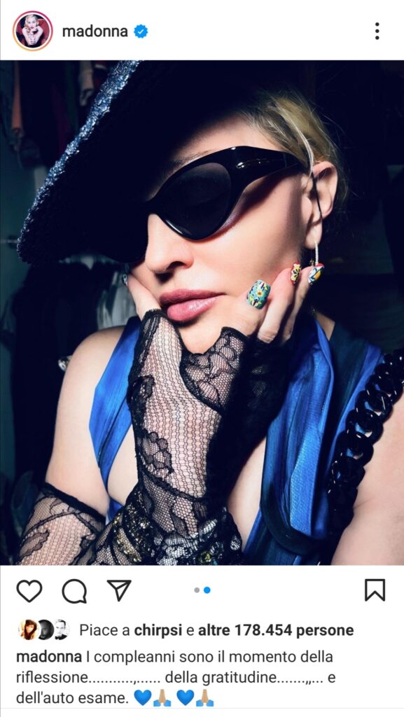 — Maria Vittoria CORASANITI — Madonna ha compiuto 63 anni, anche se appare molto più giovane. Ha scelto di festeggiarlo in Italia, precisamente in Puglia nel magnifico resort Borgo Egnazia, insieme ai suoi 5 figli ed al giovane fidanzato Ahlamalik Williams, che ha 36 anni in meno di lei. Ricordiamo che Madonna ha origini italiane, abruzzesi, ed è molto legata all’Italia.