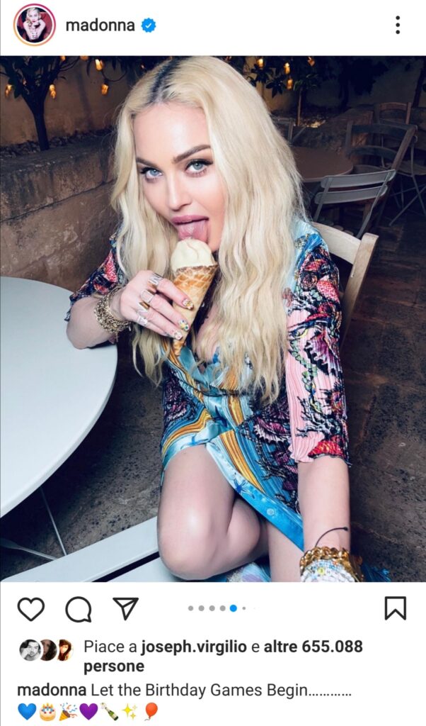 Tutto documentato attraverso le foto pubblicate da lei sui social network. Da esse si evince che la popstar è giunta in Italia con un volo privato. Madonna si mostra insieme al suo compagno mentre mangia un gelato. Per poi postare lo scatto della torta, una grande croce, come abbiamo già scritto prima, in stile bizantino. Durante l’evento ha indossato un vestito di Versace.