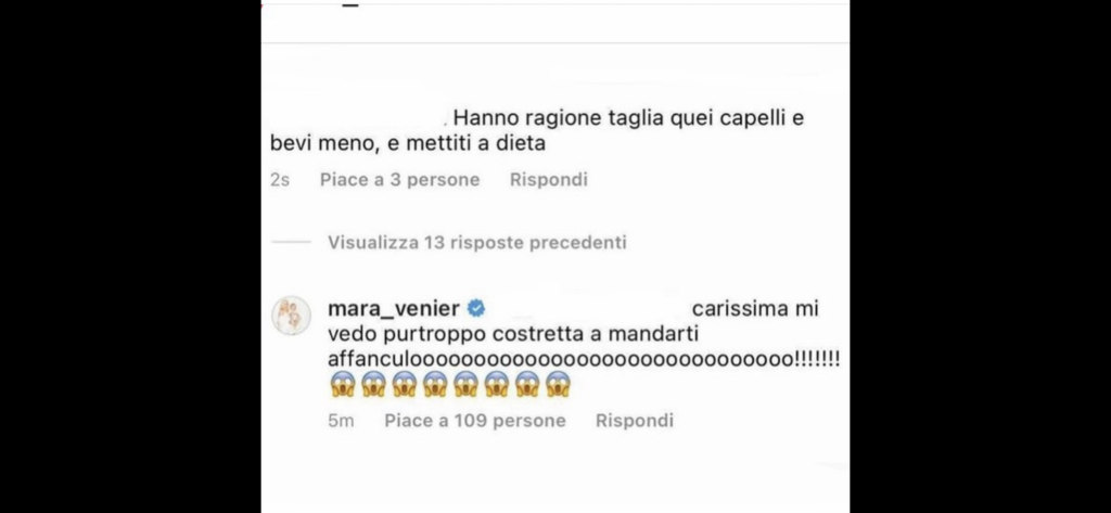Insomma parole non proprio carine che non farebbero piacere a nessuno , e Mara da guerriera quale è non si lascia intimorire e risponde a tono “scrivono donne infelici io a 70 anni sono libera”.