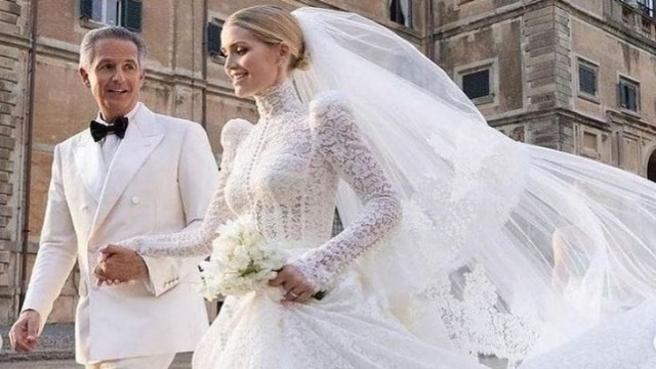 Sposata a Frascati a Villa Aldobrandini con Michael Lewis, in un week end di piena estate principesco e molto riservato . Cerimonia e festeggiamenti blindati, dove la sposa ha sfoggiato diversi outfit della maison.