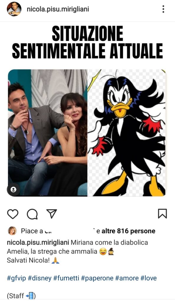 La paura di Miriana è il futuro, su quello che potrebbe avvenire dopo l’uscita dalla casa del Grande Fratello Vip6. Sulla coppia che si sta formando, Patrizia Mirigliani, madre di Nicola, e lo staff social di Nicola Pisu, i quali stanno gestendo appunto i suoi profili social, non sono molto contenti di quanto sta accadendo. Lo si evince dal post pubblicato su Instagram sul profilo di Nicola, da parte del suo staff. Una foto in cui appaiono insieme Nicola e Miriana, affianco la strega Amelia dei fumetti della Walt Disney e la scritta: