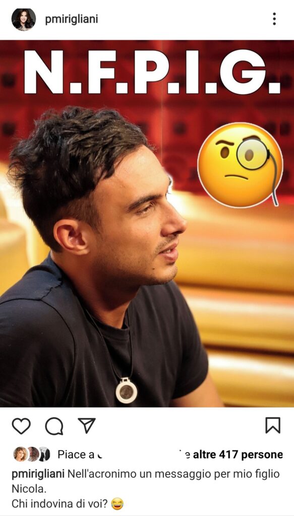 La Mirigliani anche lei lascia dei commenti un po’ strani, lei ha pubblicato una foto del figlio correlata dalla scritta: “N.F.P.I.G.”, Aggiunge: “Nell’acronimo un messaggio nascosto per mio figlio Nicola. Chi indovina di voi”? Il significato dovrebbe essere “Non Farti Prendere In Giro”.