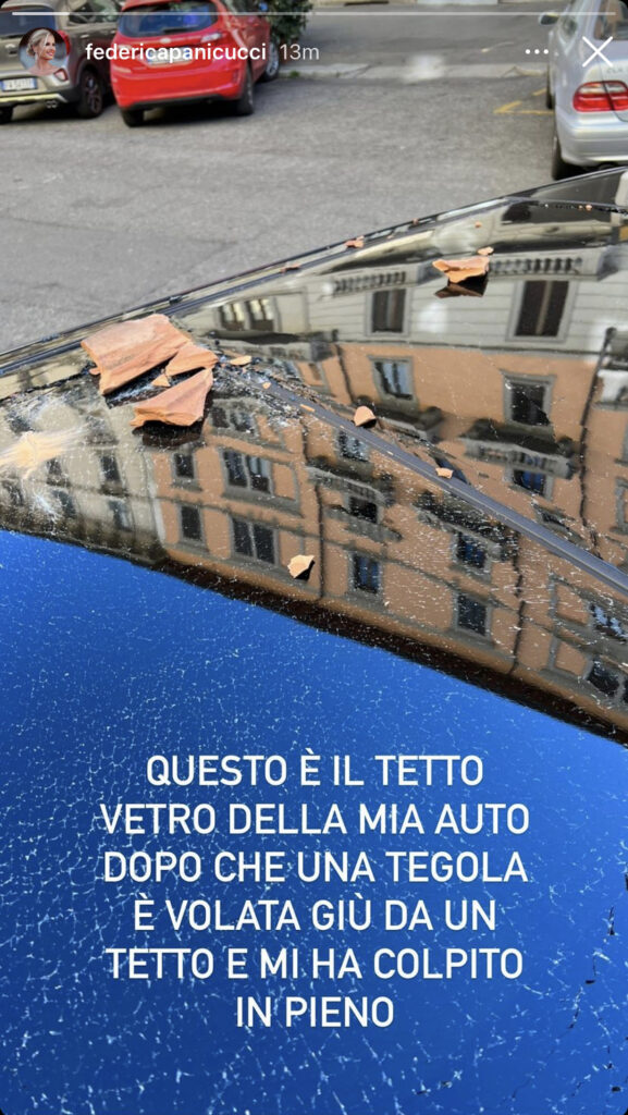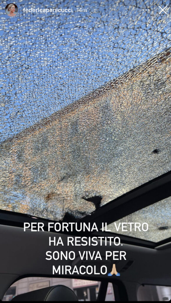 “Questo è il tetto vetro della mia auto dopo che una tegola è volata giù da un tetto e mi ha colpita. Per fortuna il vetro ha resistito. Sono viva per miracolo“, commenta.