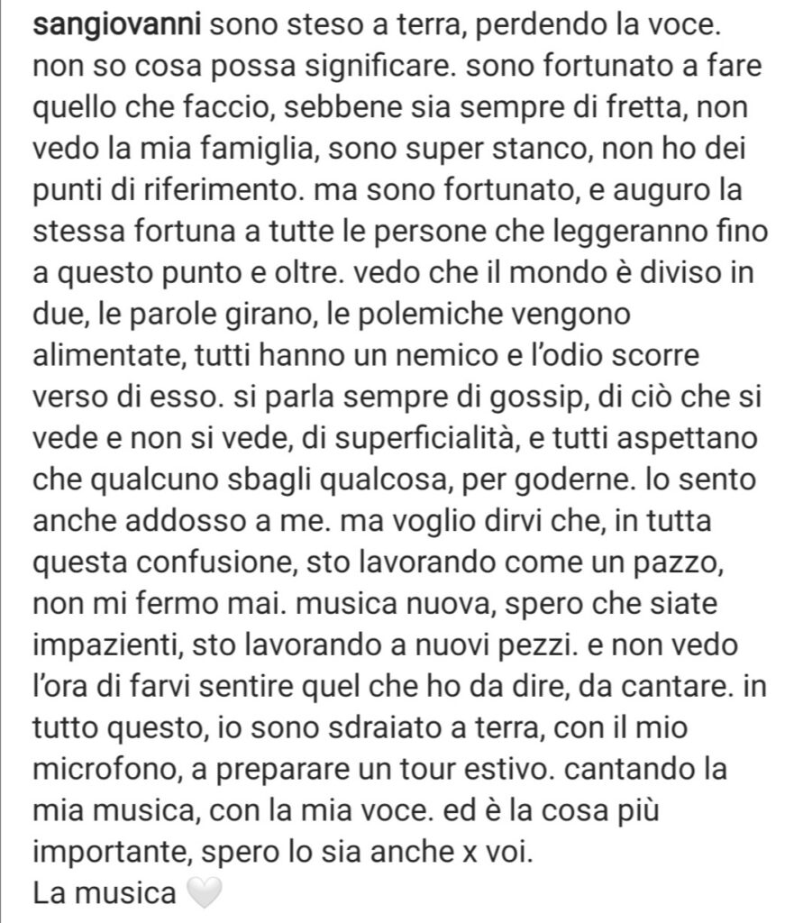 “Sono steso a terra, perdendo la voce. Non so cosa possa significare. Sono fortunato a fare quello che faccio, sebbene sia sempre di fretta, non vedo la mia famiglia, sono super stanco, non ho dei punti di riferimento. Ma sono fortunato, e auguro la stessa fortuna a tutte le persone che leggeranno fino a questo punto e oltre. Vedo che il mondo è diviso in due, le parole girano, le polemiche vengono alimentate, tutti hanno un nemico e l’odio scorre verso di esso. Si parla sempre di gossip, di ciò che si vede e non si vede, di superficialità, e tutti aspettano che qualcuno sbagli qualcosa, per goderne.