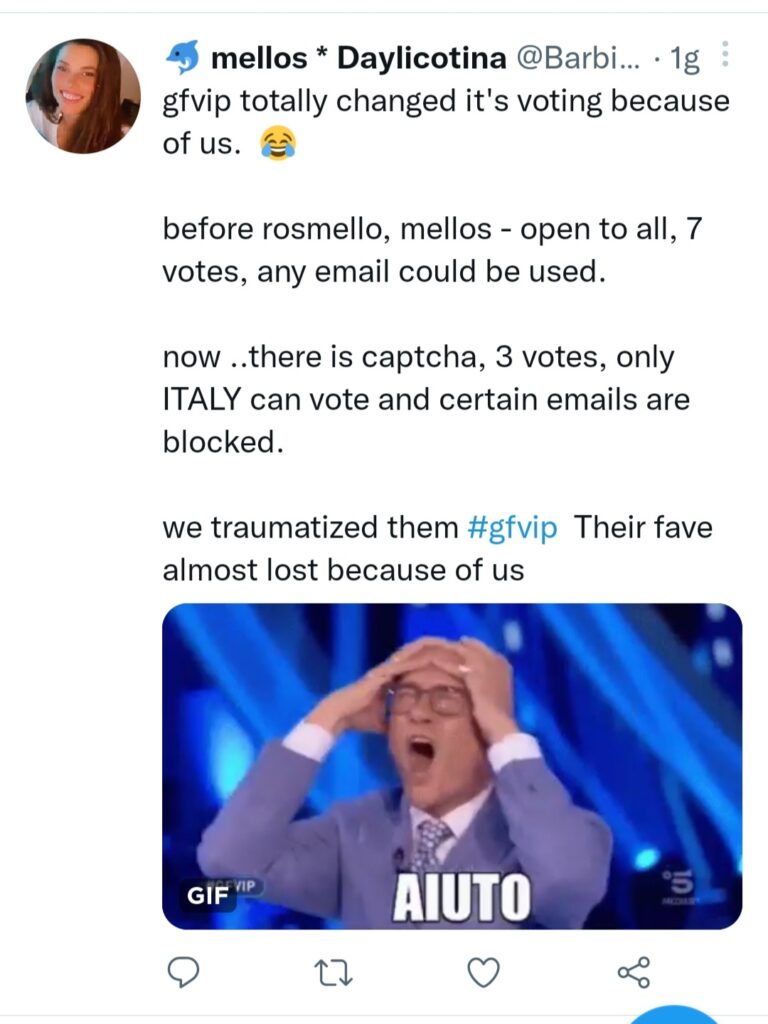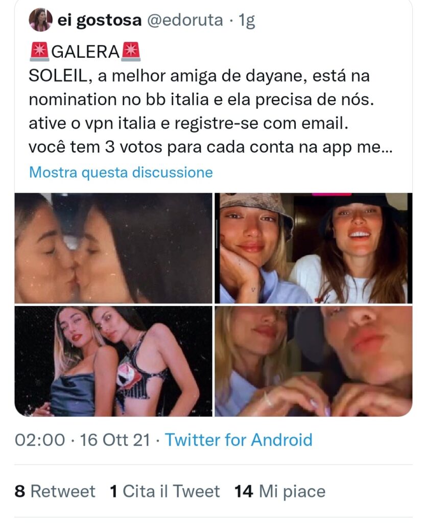 Ed ecco che quindi chi si trova in Brasile, può benissimo votare attraverso il suo computer o cellulare, su un sito o social italiano senza essere bloccato. In ogni caso si sono fatti sgamare, perché su Twitter molti brasiliani fans di Dayane Mello, hanno pubblicato moltissimi post, chiedendo di votare per salvare Soleil Sorge dal televoto.