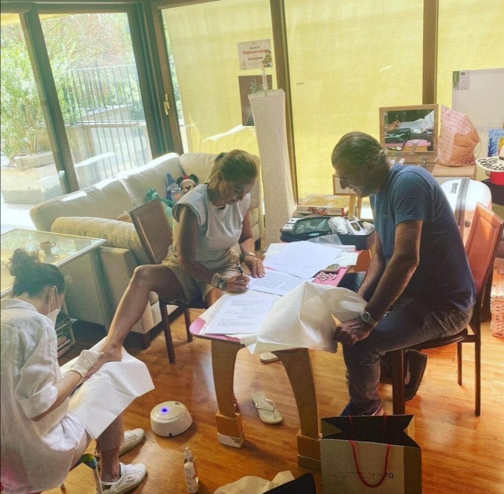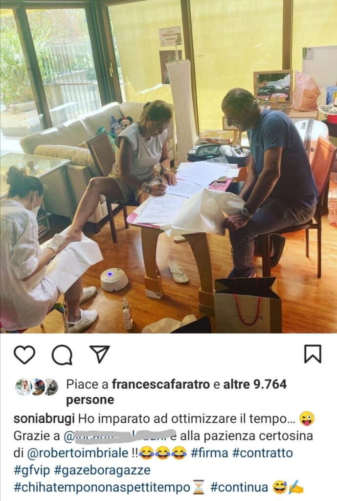 — Maria Vittoria CORASANITI — Sonia Bruganelli sarà una delle nuove opinioniste del Grande Fratello Vip, in queste ore ha firmato il contratto. Ha voluto condividere questo momento con i suoi fans, pubblicando una foto, in cui però appare un particolare un po’ sconcertante, che ha scatenato l’ira funesta del pubblico del web. In essa appare mentre appunto firma il contratto in presenza di Roberto Imbriale, vicino a lei l’estetista che le faceva la pedicure. Ecco perché sono partiti commenti negativi, come ad esempio: