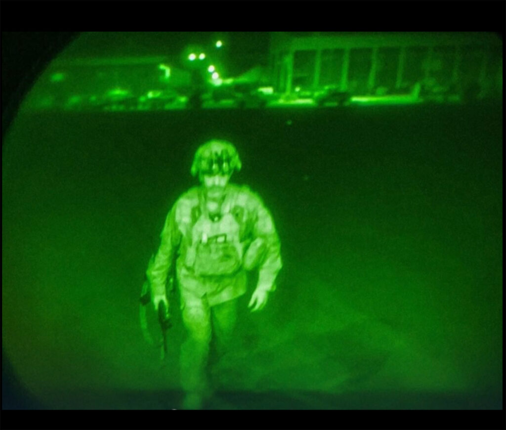 Una foto destinata a fare la storia, il maggiore generale è ritratto con una luce fotocamera notturna, prima di abbandonare il suolo di Kabul con il cargo  C-17.